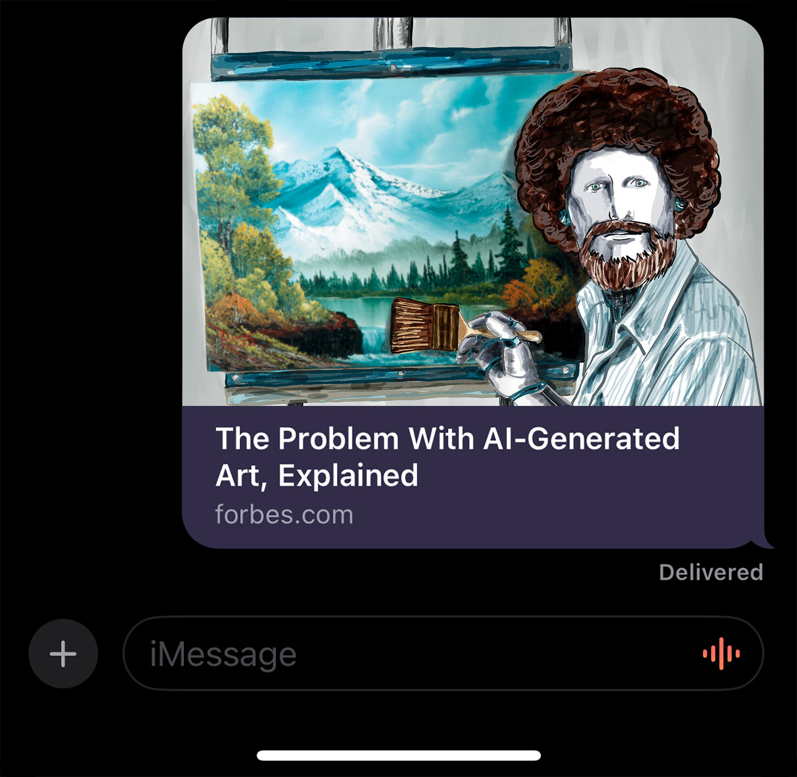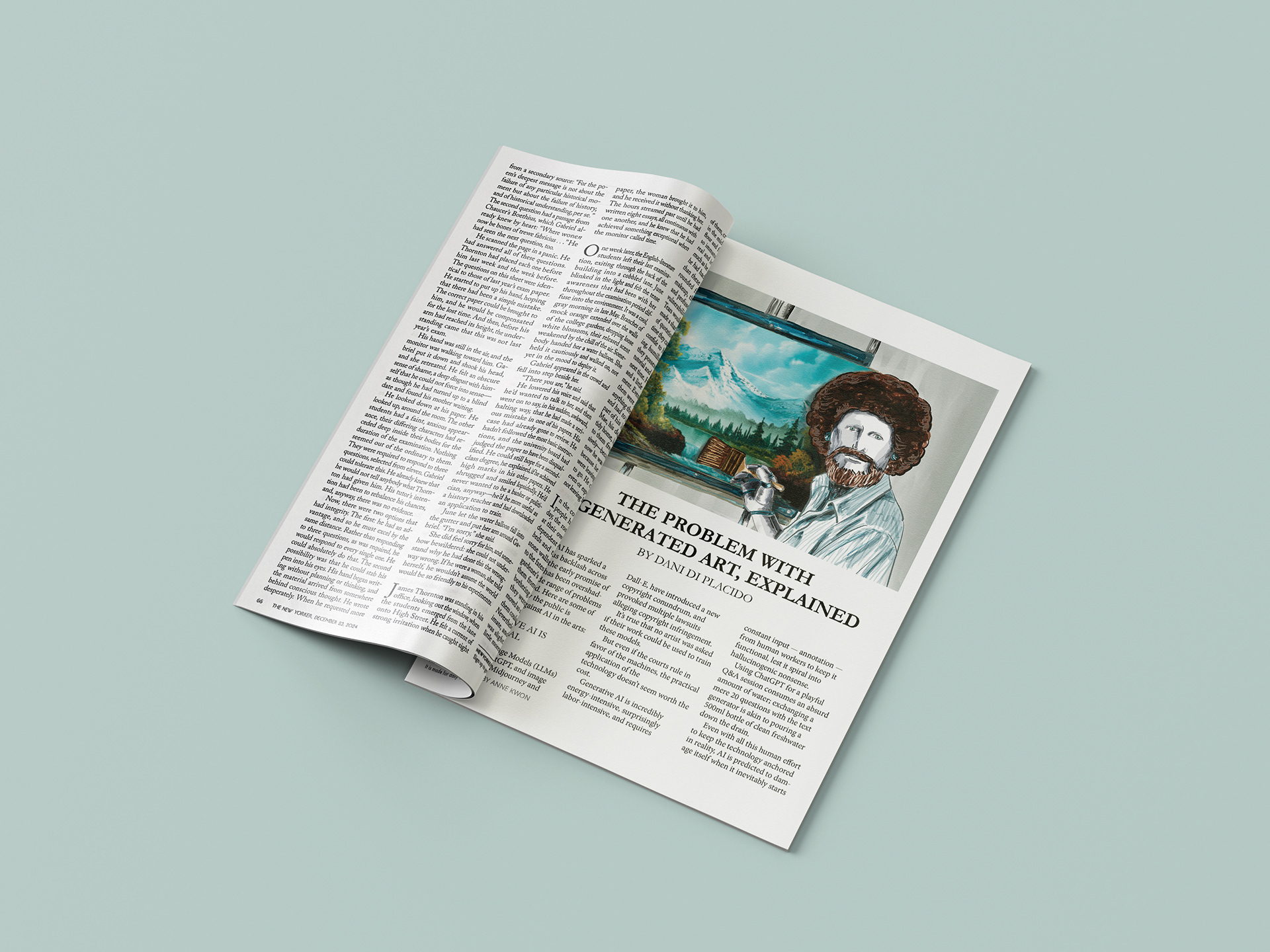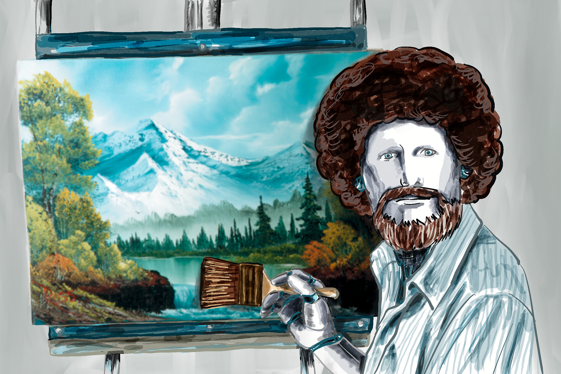 This piece merges the warm, encouraging persona of Bob Ross with cold robotic elements through photobashing techniques. The jarring combination creates an intentionally uncanny effect, prompting reflection on whether the comfort and connection we feel from figures like Ross could authentically come from artificial sources. The work investigates our emotional relationship with increasingly humanlike AI.